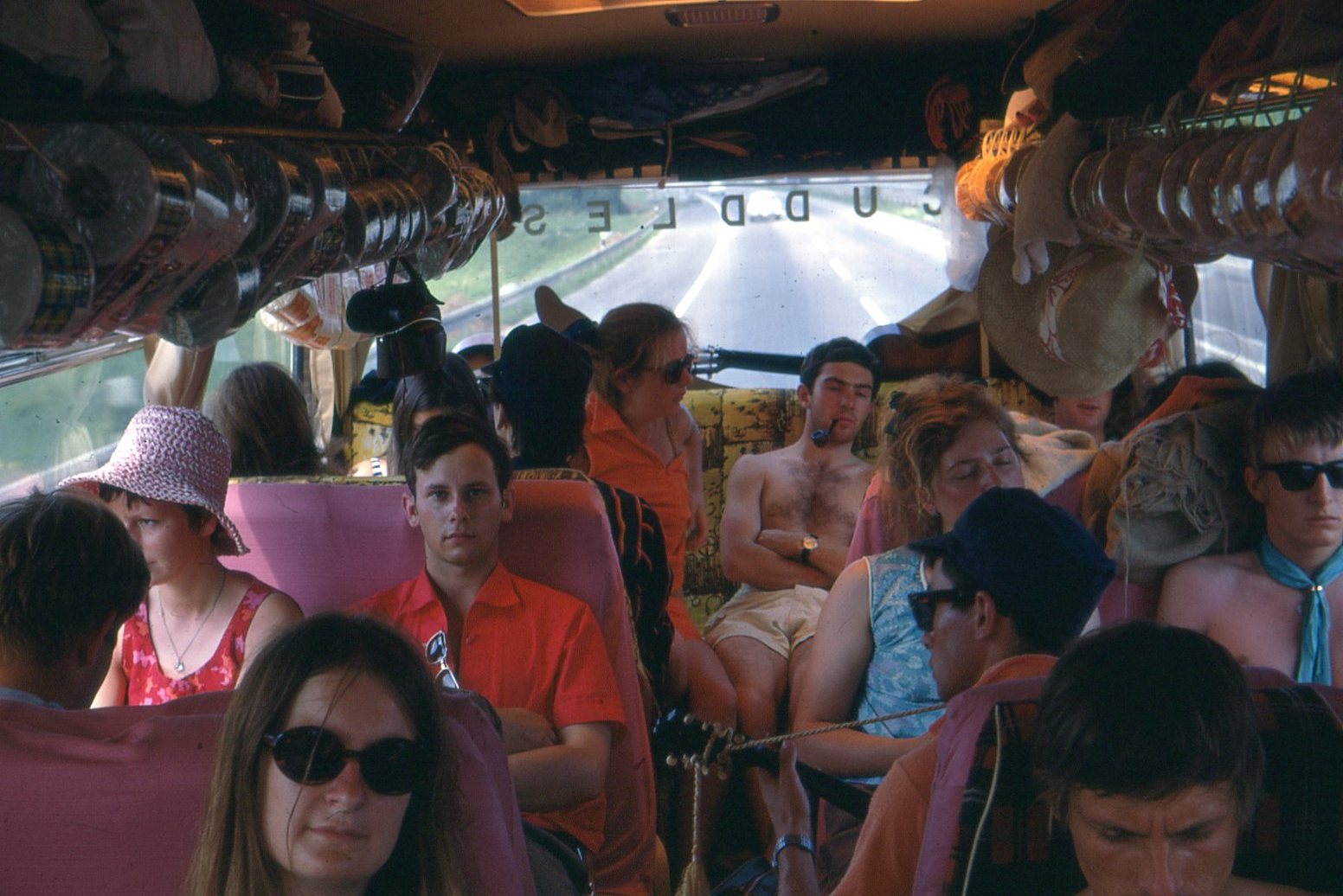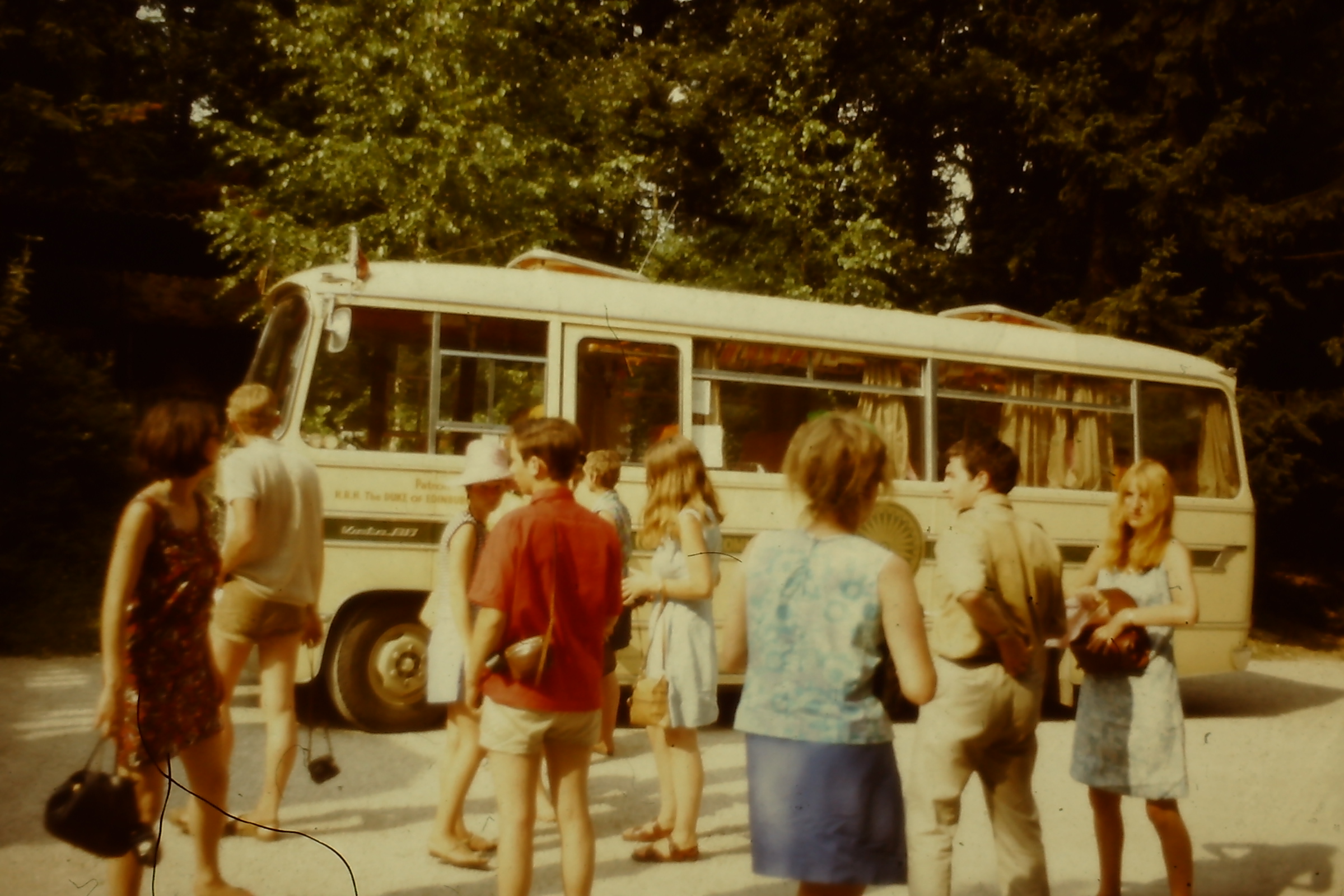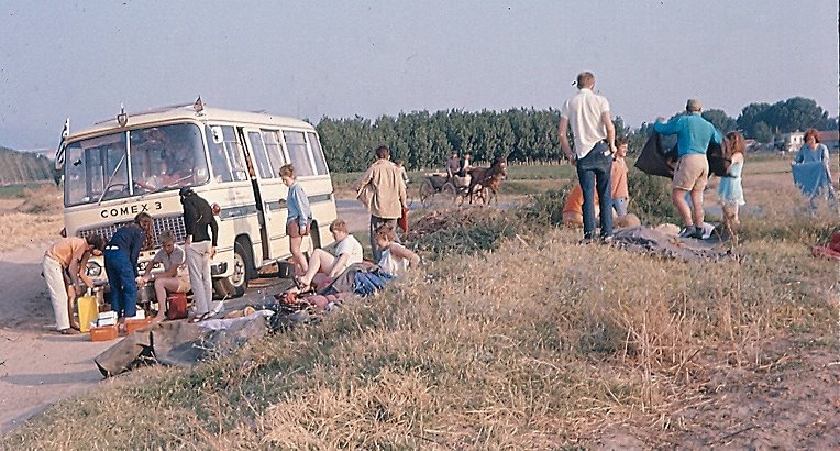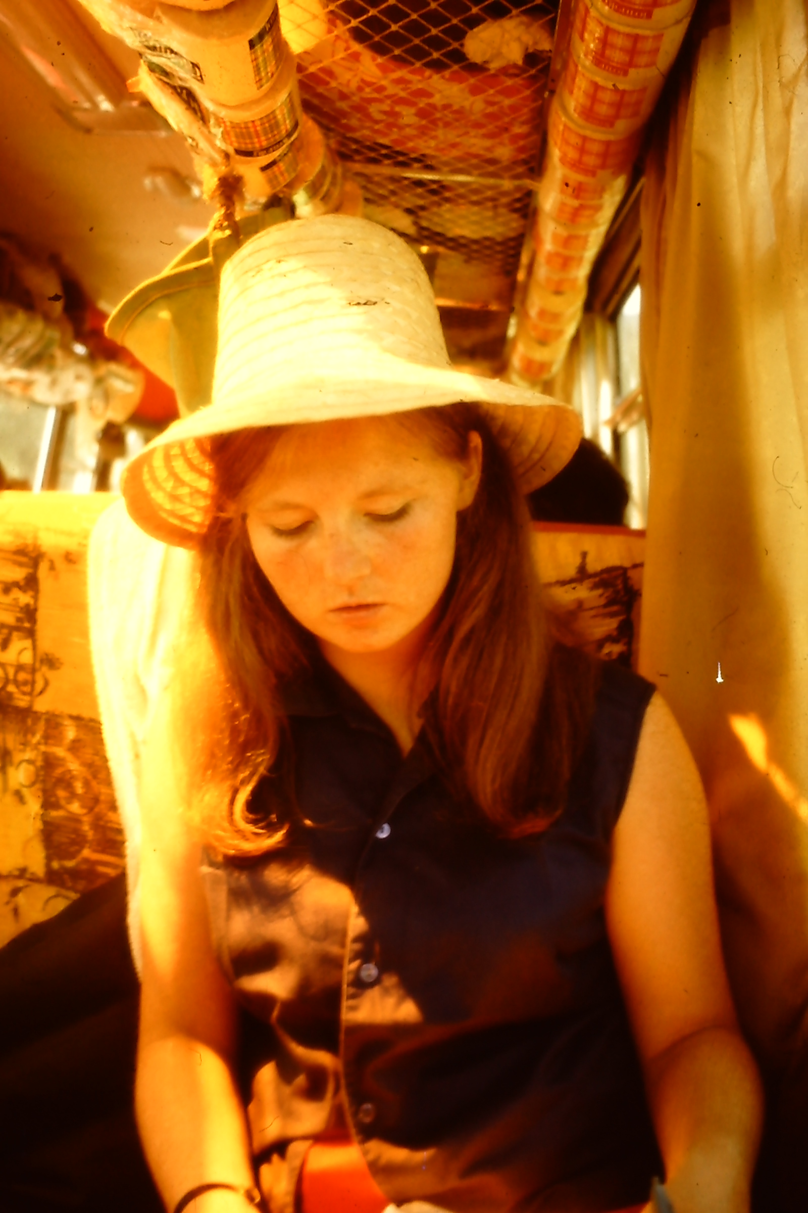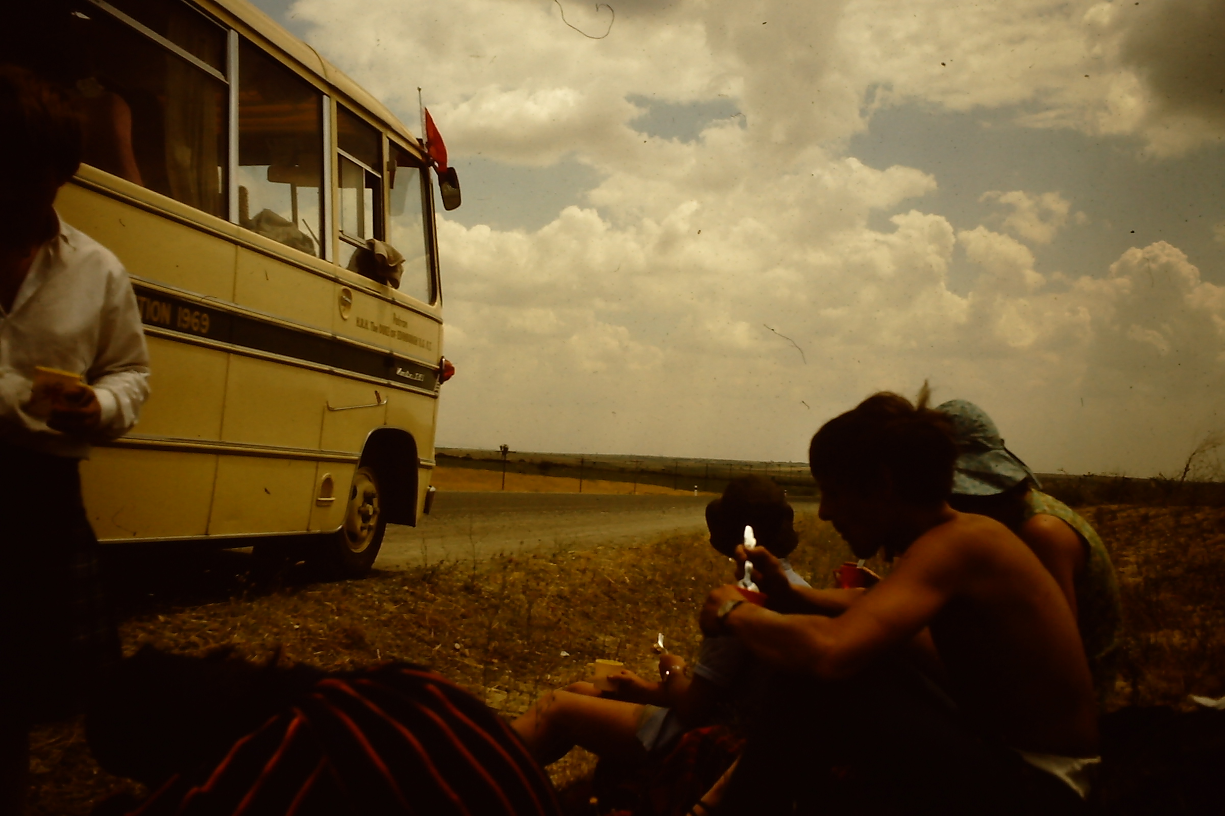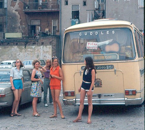 provisions at the front of the bus. The weather was hot and we were parked in a town square. I remember Fay