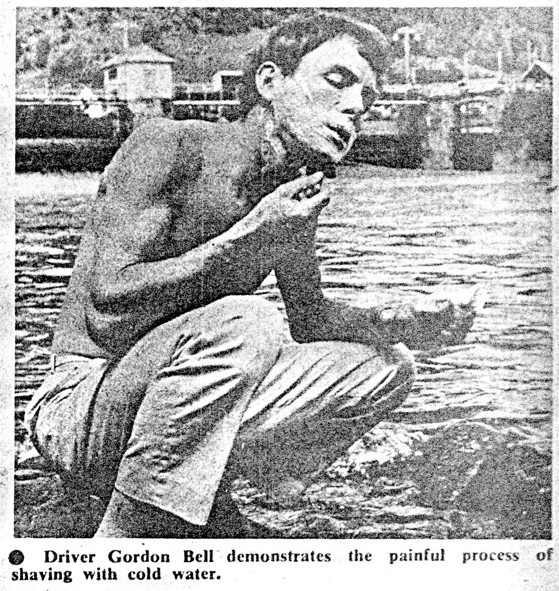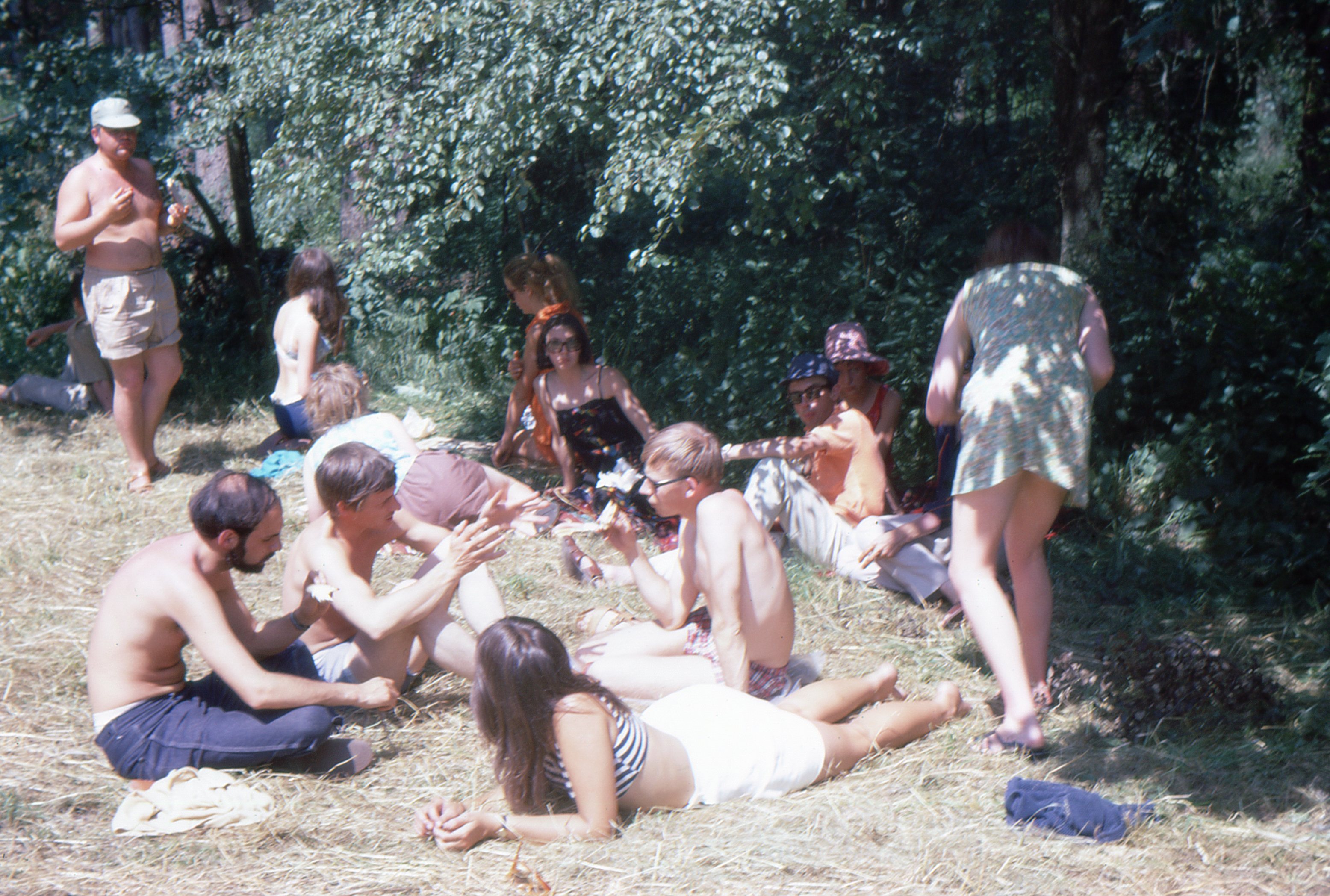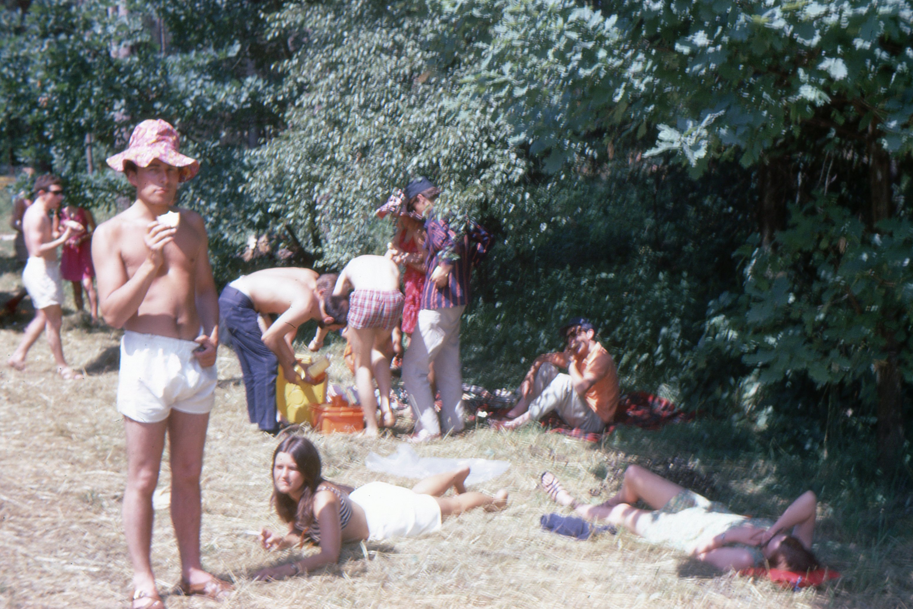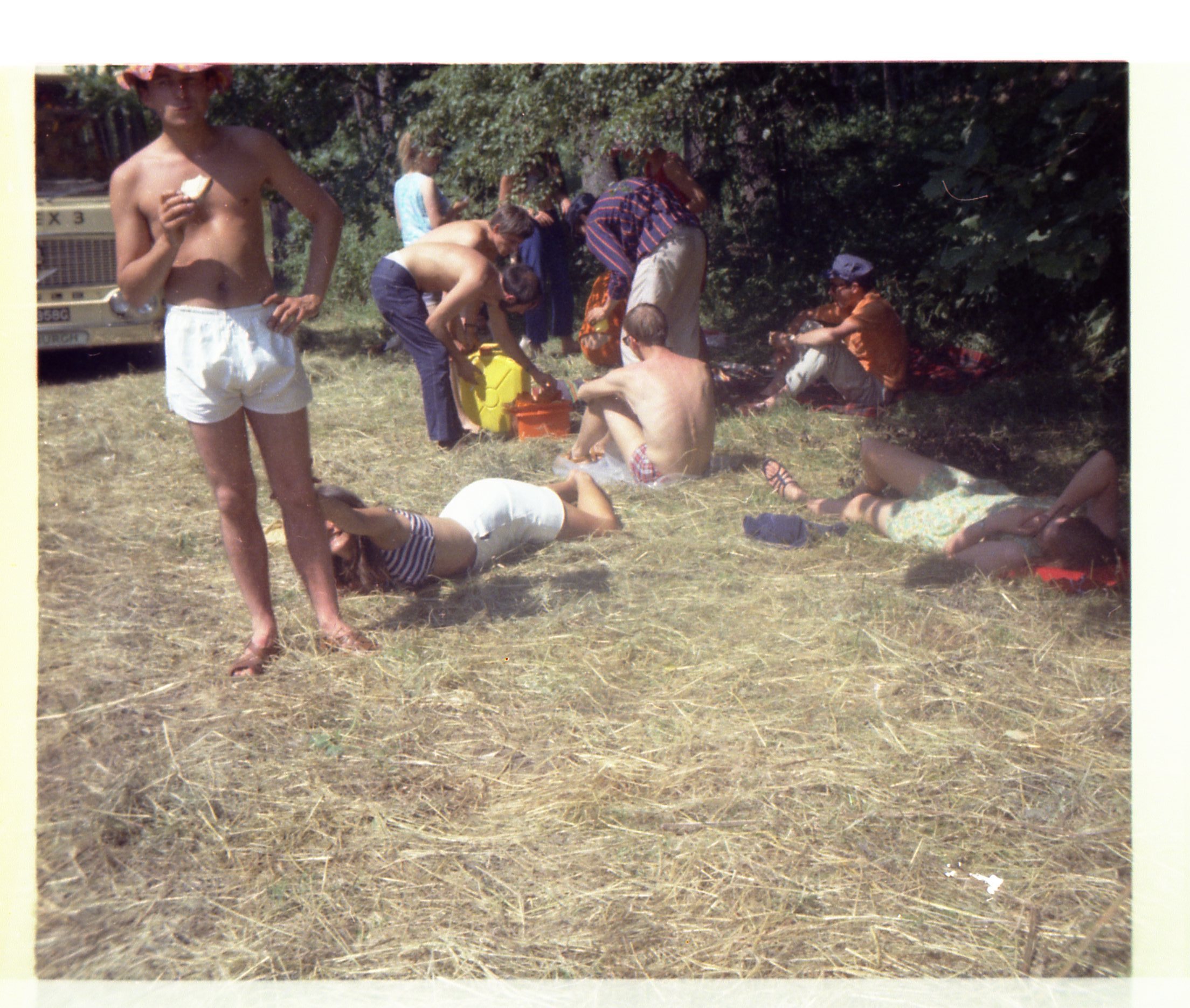 provisions at the front of the bus. The weather was hot and we were parked in a town square. I remember Fay