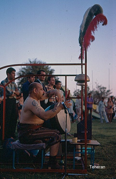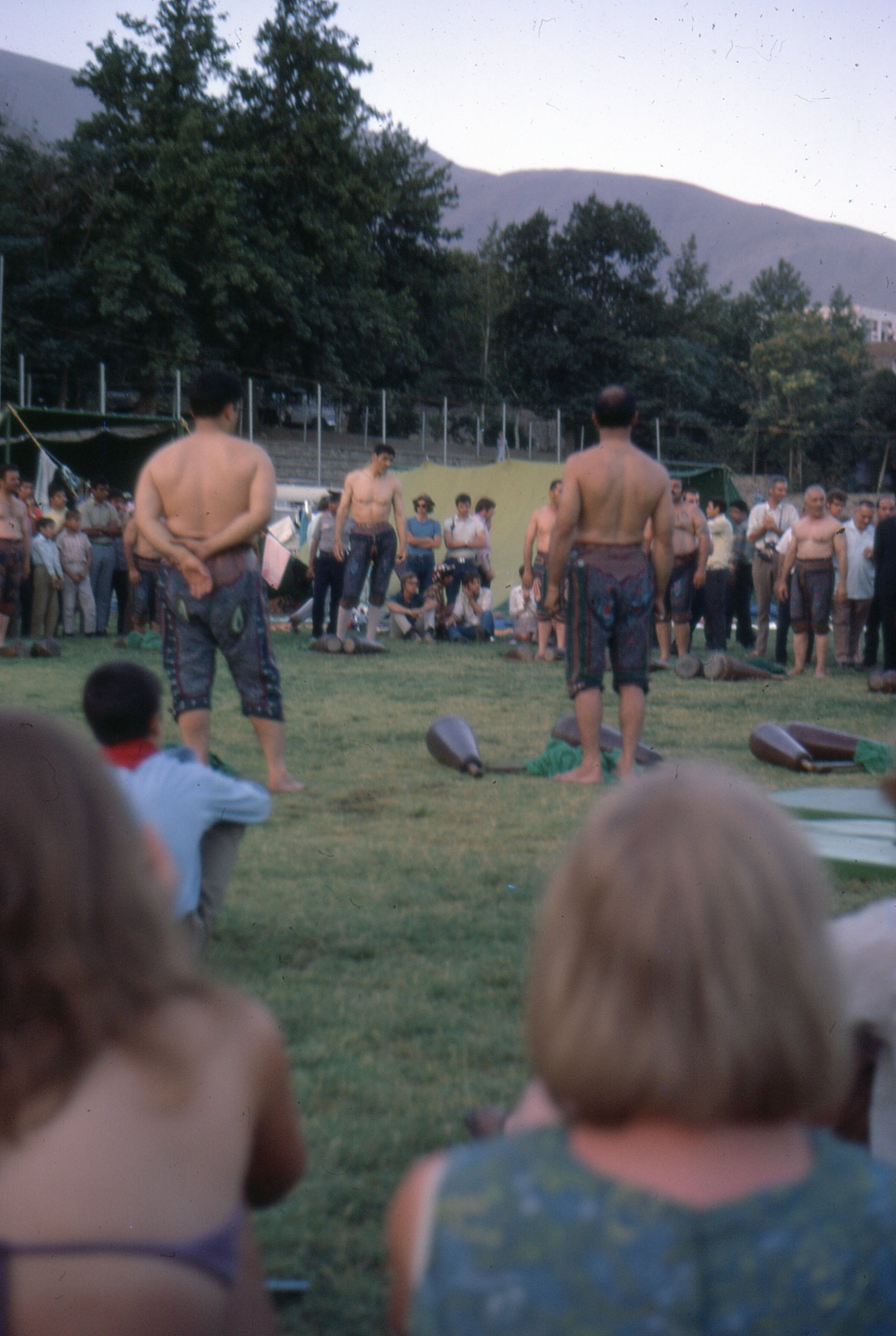 One of the men was 8 ft tall, tallest man in Iran. Some had elaborate tattoos. Patterned breeches, Persian designs, knee length.